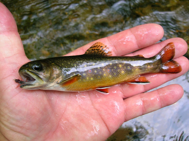 While I observed no rises, not that there weren't any, I tied on a wet fly. the Red Pin. I fished the fly in the riffles leading to deeper water with undercuts. Soon there was a strike and a brookie was at hand.