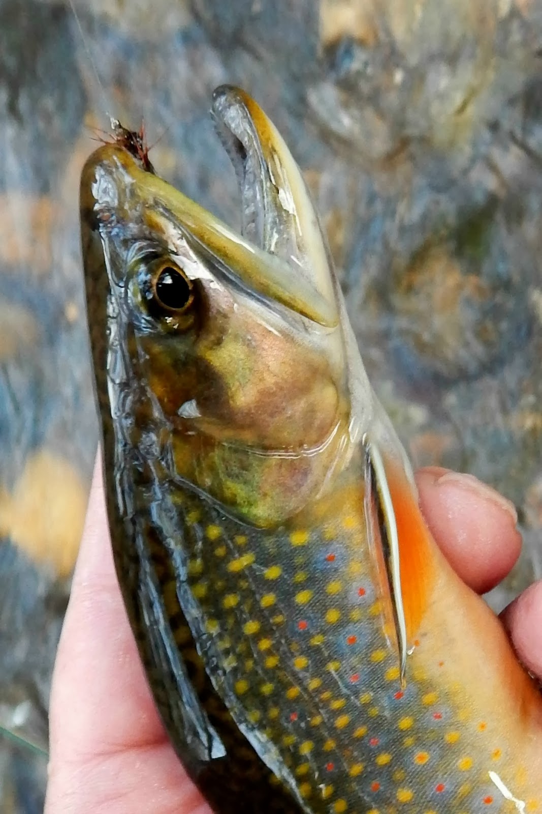 In a few moments I had the fish to hand. A beautiful wild brook trout. The color as well as the hook on the jaw stood out. A quick photo and off he went.